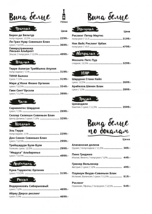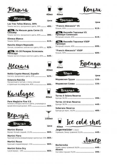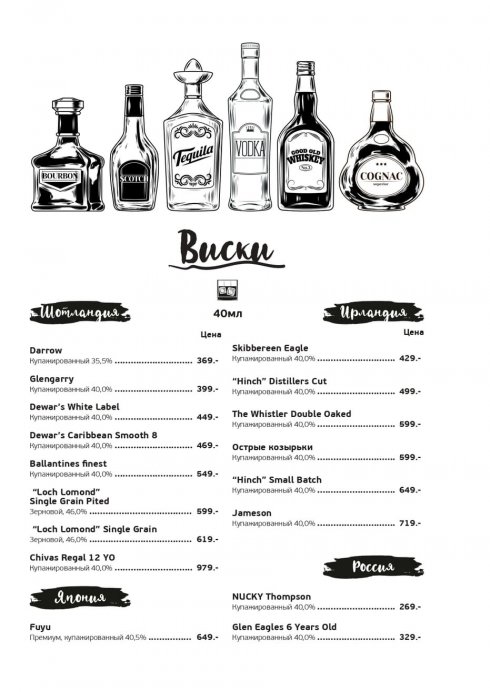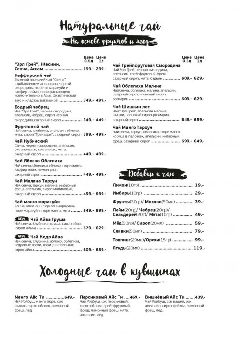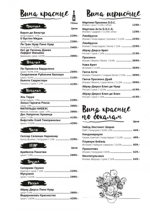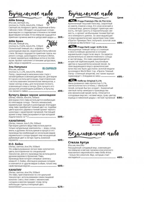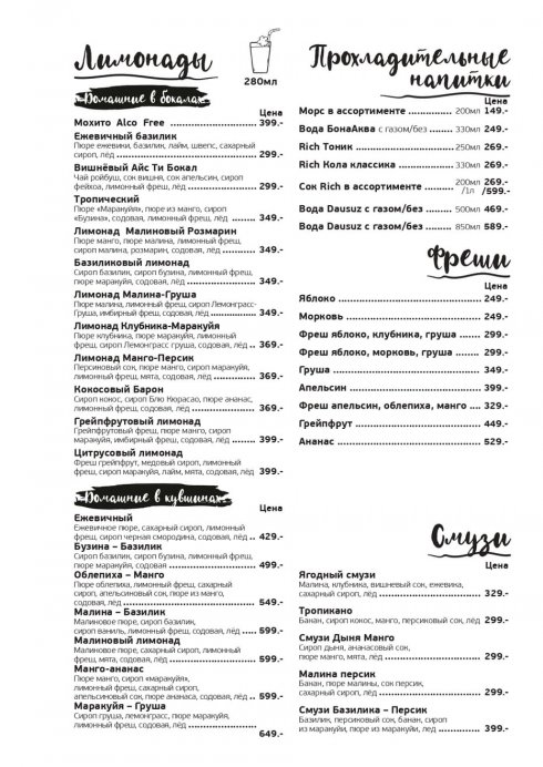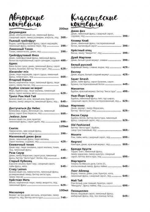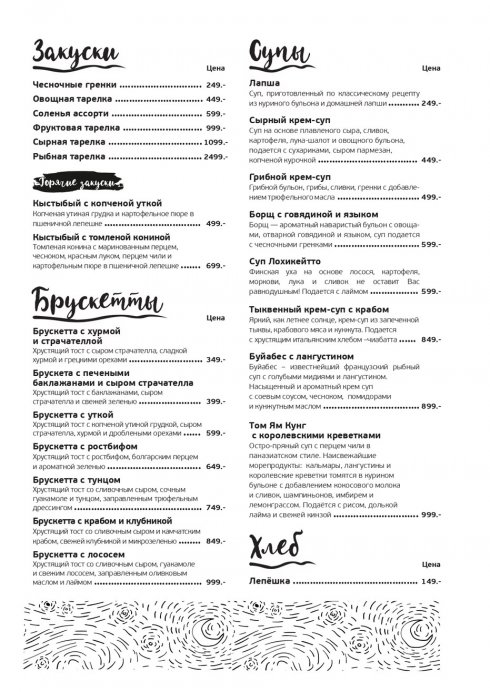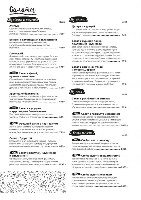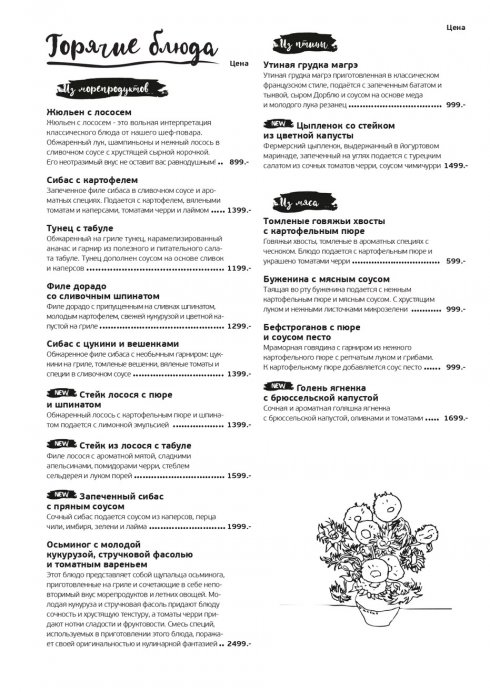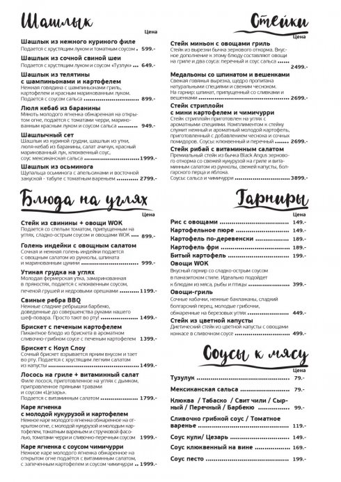 В меню ресторана представлены блюда Европейской, Азиатской и Ближневосточной кухни, а также специалитеты Татарстана. Стейки из мяса и рыбы запекают на углях. Овощи обжаривают на сковороде wok. Кулламу и Кыстыбый готовят из свежей конины.