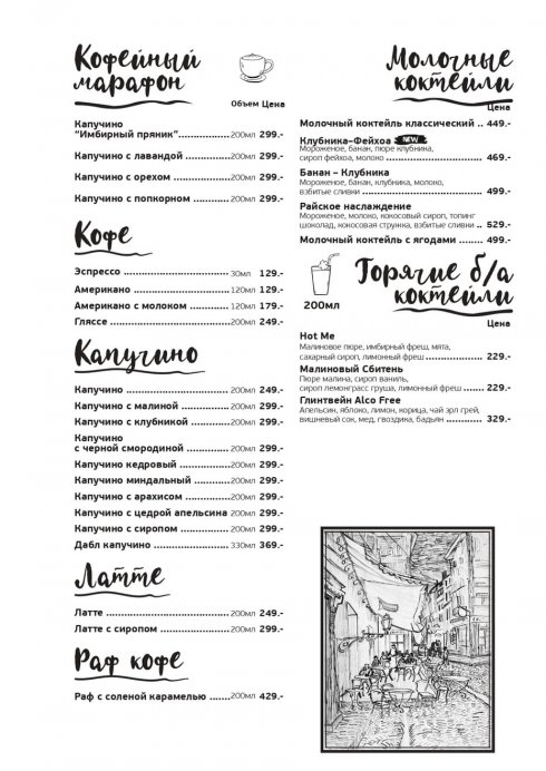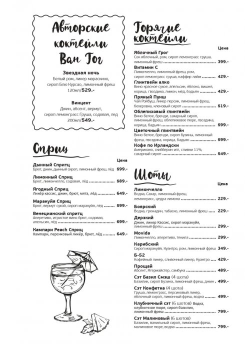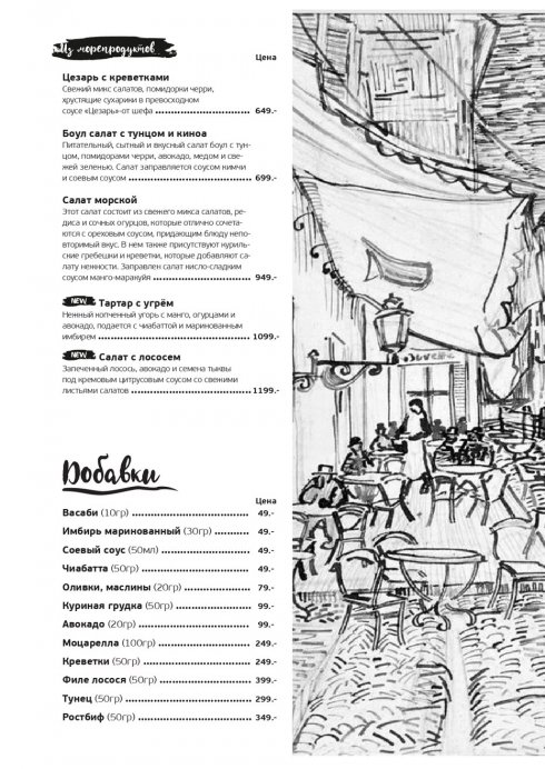 В меню ресторана Van Gogh сочетаются мировые кулинарные традиции и специалитеты Татарстана. В разделе холодных закусок брускетта с лососем, перуанский салат с тунцом и хрустящие баклажаны. В качестве первого блюда готовят русский борщ с говядиной, татарский токмач или японский том ям. На горячее – кыстыбый с копченой уткой, стейк лосося с пюре и шпинатом и ризотто с морепродуктами. На десерт подают карамельный пирог и шоколадный брауни.