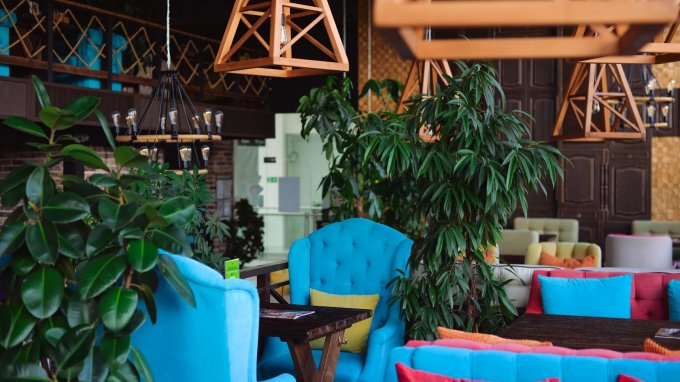 Интерьер ресторана – это открытое современное пространство в минималистичном дизайне. Широкие окна занимают почти всю стену, позволяя помещению наполниться светом. Живые растения украшают каждый угол комнаты. На втором этаже находится летняя терраса под открытым небом. В ресторане есть отдельный банкетный зал на 25 гостей.